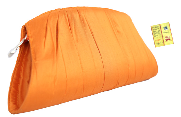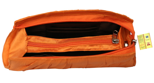 Designed with pure silk with gathered handmade ruffles. It’s basically a light weight product, easy to carry. Height of the product is 7 inches, length – 12 inches and 3 inches width. Colour of the product is Beige. Special feature of the product is zip closure. Base of the product is made with silk fabric, imported zip, fancy slider, and fibre board for stiffness, fine quality cotton fabric for inside pouches and heavy magnetic button for zip locking system. Special features for inside pouches – mobile, credit card, jewellery holders and money pouch. Specially designed for gifting, also used on special occasions and daily routine.